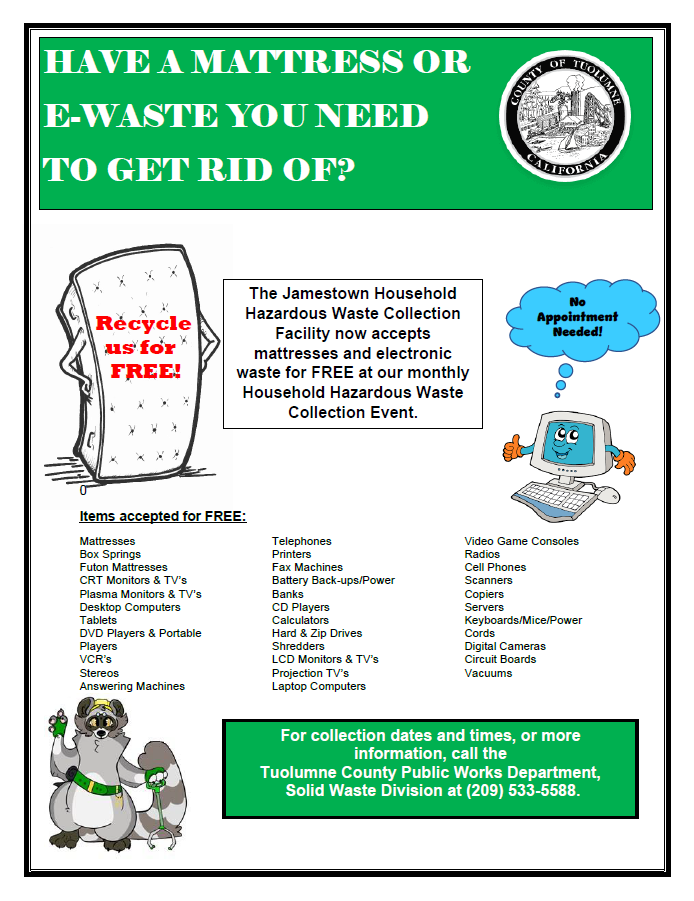 For collection dates and times, or more information, please contact the Tuolumne County Department of Public Works, Solid Waste Division at (209) 533-5588.