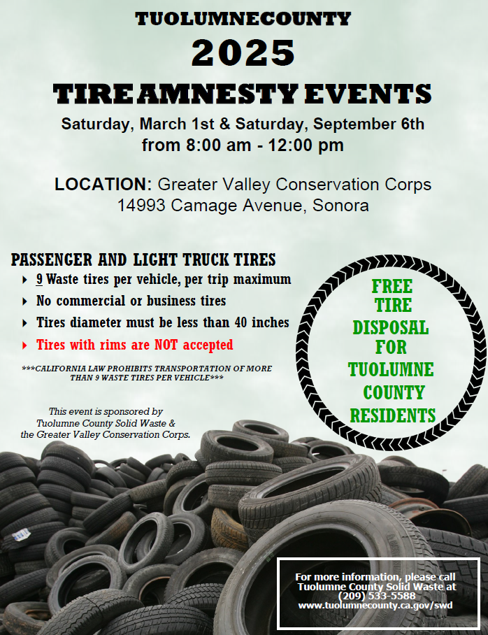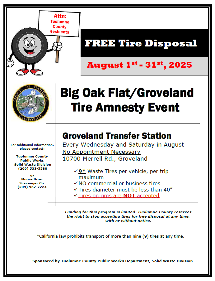 For a fee, tires may be taken to Cal Sierra Transfer Station or Groveland Transfer Station.
